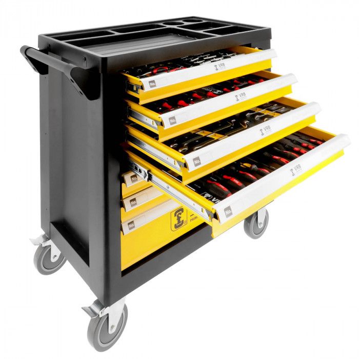 Alatnička kolica VRB su kompaktnog i mobilnog dizajna. Savršeno će se uklopiti u sve vrste prostora, kako za kućne majstore u garaži, tako i za profesionalne radionice i proizvodne linije. Ima 7 ladica, od kojih je 6 ispunjeno setom od 258 alata.