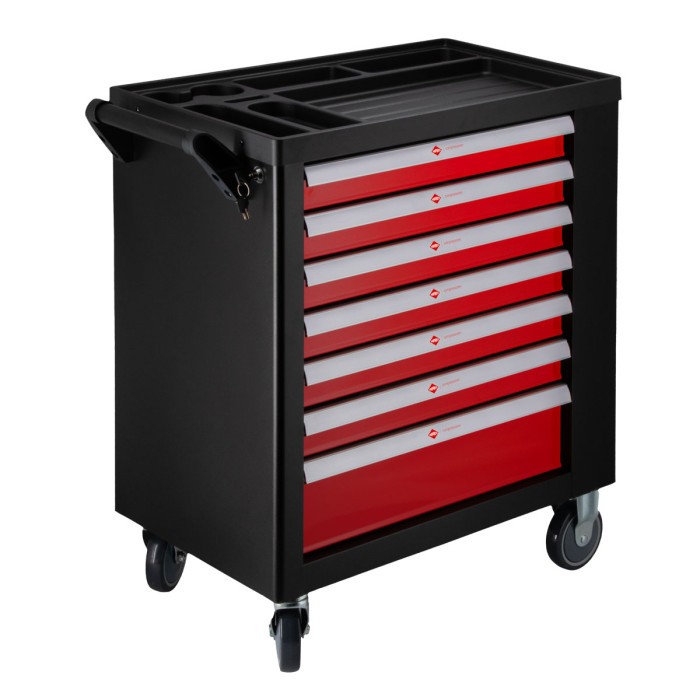 Kompaktni alatni kolica 250 elemenata, 7 fioka su funkcionalno rešenje za organizaciju alata u radionici. Opremljena sa 250 alata i 7 fioka, kolica pružaju lak pristup i skladištenje dodataka. Dodatno, imaju ormar sa podešavajućim kukama, centralnu bravu, ojačane kuglične vodilice i 4 točka (2 okretna, jedan sa kočnicom), što obezbeđuje udobnost i sigurnost upotrebe. Radna površina sa izrezbarenim mestima za skladištenje alata omogućava brzi pristup i održavanje reda. Čvrsta konstrukcija i ergonomska ručka čine ih pouzdanim izborom za svaku radionicu.