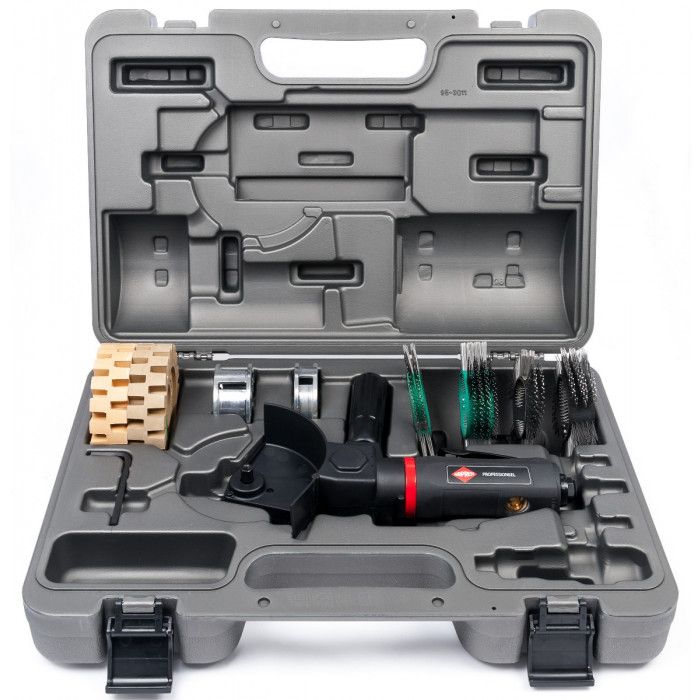 Višenamjenska četka 45429 Airpress je svestran uređaj za čišćenje čeličnih, drvenih i lakiranih površina. Kompozitna gradnja, udobna bočna ručka i okidač u dršci omogućuju udoban rad. Maksimalna buka uređaja snižena je na 83 dB(A) zahvaljujući sustavu prigušenja buke. Visoki okretaji na razini od 3500 /min i niz dodatnih pribora omogućavaju učinkovito i sigurno čišćenje čak i osjetljivih površina. 2 širine adaptera od 11mm i 23mm omogućuju čišćenje kako ravnih površina tako i uskih udubljenja. Žičane četke najbolje su za uklanjanje hrđe s metalnih dijelova, ali i boje s drvenih elemenata. Gumene ploče raznih granulacija učinkovito uklanjaju naslage, ljepila, naljepnice i druge materijale s osjetljivijih površina – također lakiranih. Standardno opremljena koferom, bočnom ručkom i nizom žičanih četki, gumenih ploča i priključnih adaptera. Posebno preporučena za radionice za limarske i lakirerske usluge, obnovarske i uslužne radionice.