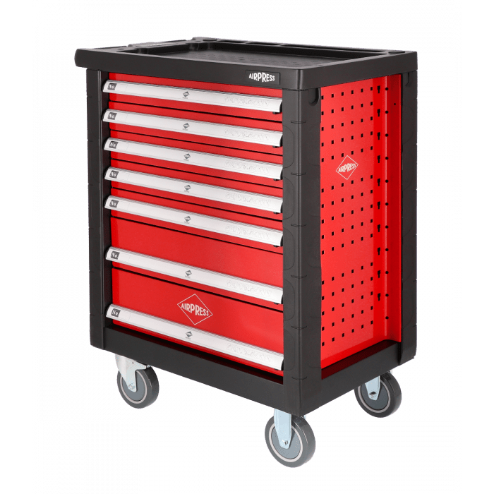 Profesionalni alatni kolica bez opreme, 7 fioka je idealna baza za stvaranje vlastitog seta alata. Čvrsta konstrukcija, stabilna radna površina, centralna brava, amortizovani uglovi i kotači s kočnicom osiguravaju sigurnost i udobnost rada. Kolica su prilagođena modularnim ulošcima alata Airpress. Odličan izbor za profesionalce i majstore.
