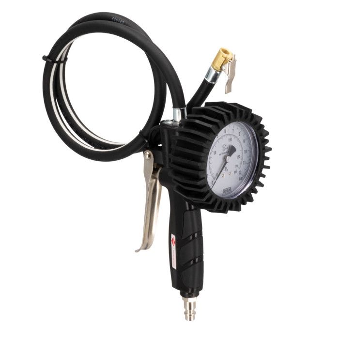Profesionalni pištolj za pumpanje sa manometrom 12 bar i crevom 90 cm, idealan za precizno pumpanje guma. Zahvaljujući laganoj konstrukciji (0,5 kg), velikom manometru (80 mm) i fleksibilnom crevu, pruža udobnost i tačnost u radu. Opseg pritiska 0-12 bar čini ga univerzalnim alatom za različite primene.