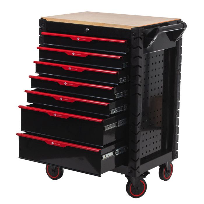 - Zahvaljujući drvenoj radnoj površini, kolica se mogu koristiti i kao mobilni radni stol, osiguravajući dodatni prostor za rad.